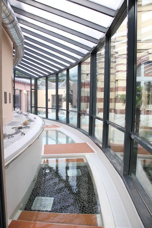 Abrités par une verrière, trois bassins successifs offrent des profondeurs et des températures variées. Le parcours, bordé par la végétation, débouche sur un jacuzzi à ciel ouvert.